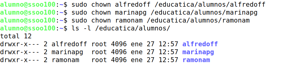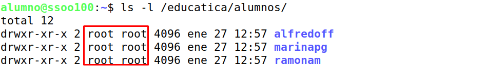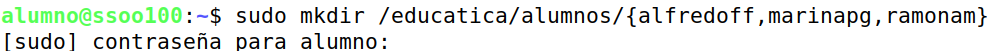 86. Crea un directorio para los usuarios alfredoff, marinapg y ramonam dentro del directorio /educatica/alumnos. Muestra los permisos de dichos directorios.