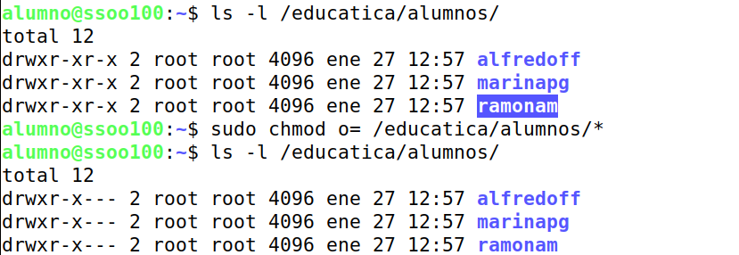 Primero vamos a quitar acceso a los otros en todos los directorios que están dentro del diretorio alumnos