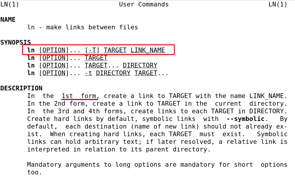 Como no sabemos como funciona el comando ln, vamos a echar un vistazo a su página de manual.