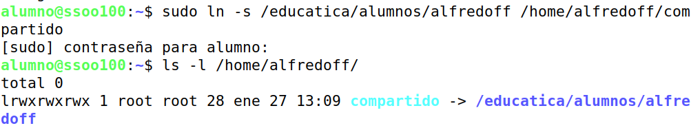 88. Crea un enlace simbólico con el nombre compartido dentro del directorio personal del usuario alfredoff a su directorio de alumno dentro de /educatica/alumnos.