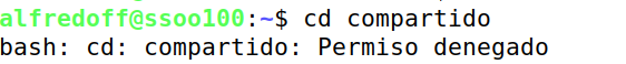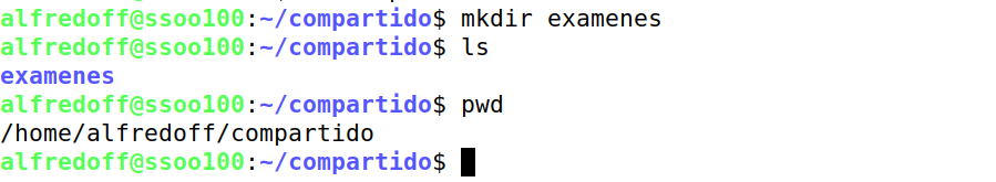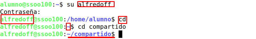 Para el usuario alfredoff, está trabajando en un directorio llamado compartido dentro de su directorio personal.