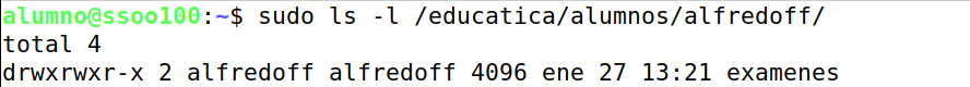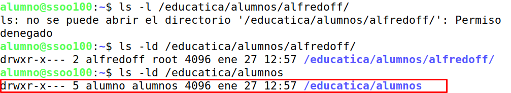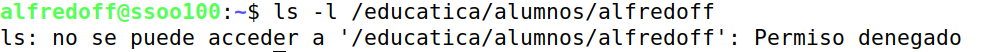 Según estos permisos alfredoff puede acceder para lectura y escritura. Sin embargo, no deja acceder. Vamos a comprobar los permisos del directorio /educatica/alumnos/alfredoff