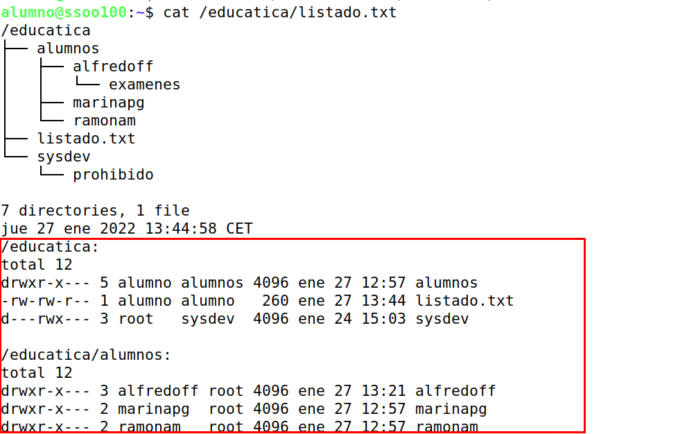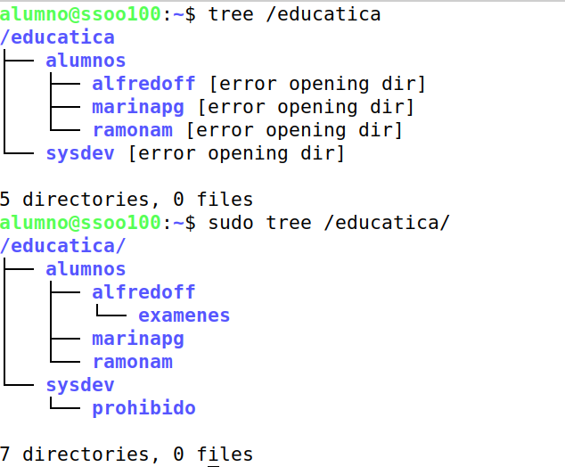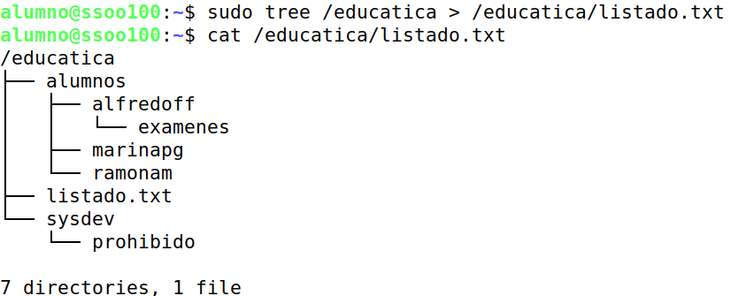 Si nos fijamos el fichero pertence a alumno, sin embargo el comando tree lo ha ejecutado root, por tanto debería pertenecer a root, ¿no?. En realidad, el usuario alumno ha ejecutado el comando sudo cuya salida se ha redirigido al fichero. Todo el comando lo ha ejecutado el usuario alumno, por eso el fichero de la redirección pertenece a alumno.