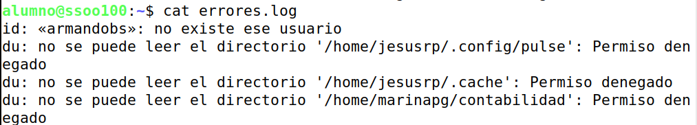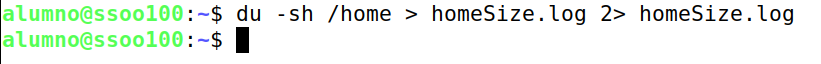 99. Almacena en el fichero homeSize.log el resumen de la ocupación en disco de los directorios personales de los usuarios del sistema. Si se produce algún error, que se almacene también este fichero