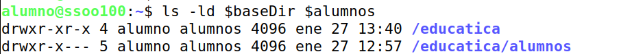 103. Muestra información de permisos propietario y grupo de los directorios cuya ruta está almacenada en baseDir y alumnos.