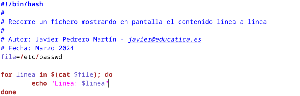 Vamos a recorrer un fichero, cualquiera, el que queramos. Lo único que tenemos que hacer es mostrar en pantalla el fichero línea a línea. Es más, delante del contenido de cada línea vamos a mostrar la cadena «Linea: » seguida del contenido de la linea.
