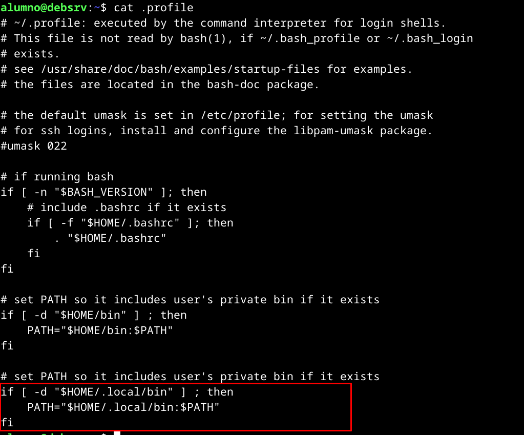 El tema es que tenemos que iniciar sesión de nuevo con el usuario para que se actualice la variable PATH al ejecutarse el fichero .profile
