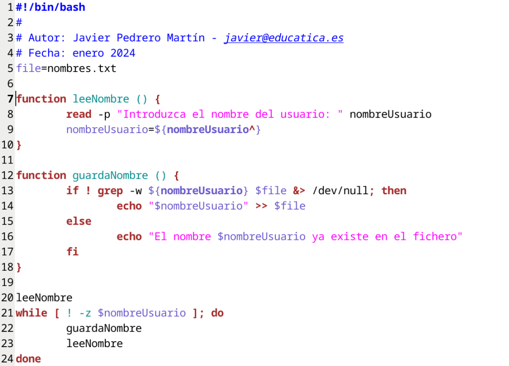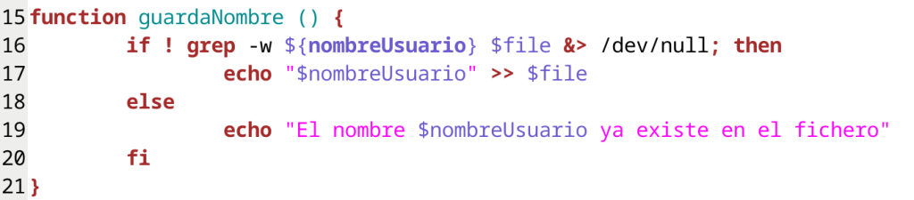 El segundo cambio lo hacemos en la función guardaNombre. Como administrador, ¿cómo comprobarías si existe un nombre, por ejemplo Maria en el fichero nombres.txt?